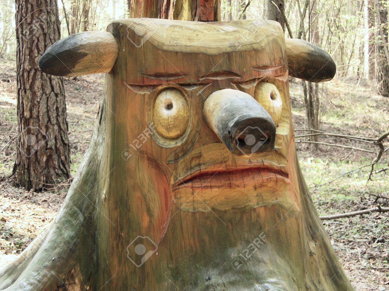 Woodcarving figure of stump in forest