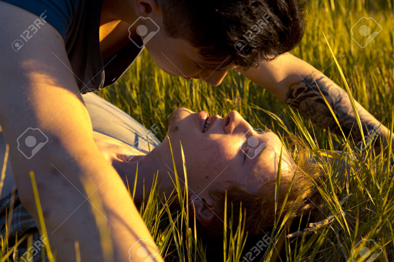 Young couple in love lying on the grass in the field at sunset
